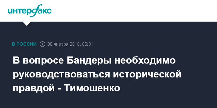 Киев. 30 января. ИНТЕРФАКС-УКРАИНА - Премьер-министр Украины, кандидат в президенты Юлия Тимошенко считает, что в вопросе присвоения звания Героя Украины Степану Бандере необходимо руководствоваться исторической правдой.