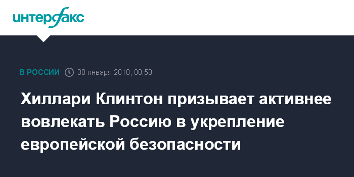 Вашингтон. 30 января. ИНТЕРФАКС - Государственный секретарь США Хиллари Клинтон считает, что Россию необходимо активнее вовлекать в процессы укрепления и развития европейской безопасности.