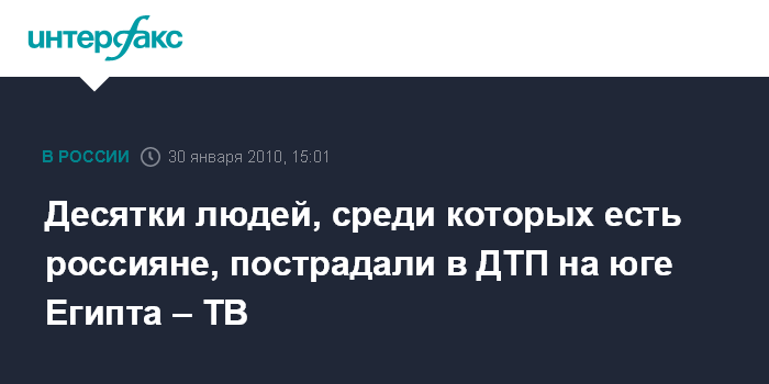 По информации российского посольства в Каире, ранения получили двое граждан РФ. Как сообщил заведующий консульским отделом посольства РФ в Египте Шамиль Утоев, пострадавшие российские граждане - мужчина и женщина доставлены в больницу Шарм-эш-Шейха. По словам Ш.Утоева, следовавший из Шарм-эш-Шейха в Каир автобус, в котором находились восемь российских граждан, перевернулся близ города Суэц. Причиной ДТП, произошедшего около 6 часов утра по местному времени, стали сложные погодные условия, вызванные песчаной бурей. Помимо россиян, в автобусе были граждане из стран СНГ.