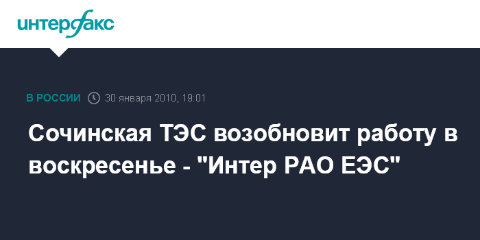 Сочинская ТЭС возобновит работу в воскресенье - "Интер РАО ЕЭС"