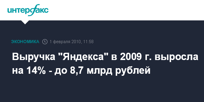 Москва. 1 февраля.INTERFAX.RU – "Яндекс" в 2009 г. увеличил выручку на 14% по сравнению с 2008 г. и составил 8,7 млрд руб., говорится в сообщении интернет-компании.