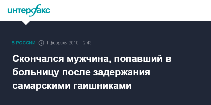 Москва. 1 февраля.INTERFAX.RU – Житель Самары, получивший тяжелые травмы в ходе задержания автоинспекторами автомобиля, скончался в больнице, сообщили агентству "Интерфакс-Поволжье" в СУ СКП РФ по Самарской области. Он провел в больнице после двух недель.