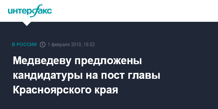 Москва. 1 февраля. INTERFAX.RU - "Единая Россия" представила президенту три кандидатуры на должность губернатора Красноярского края.