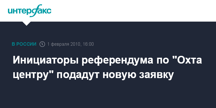 До этого избирательная комиссия Петербурга одобрила ходатайство инициативной группы поставить на референдум два вопроса по "Охта-центру". В первом горожанам предлагалось ответить, согласны ли они, что в целях сохранения исторического облика Петербурга высота зданий и сооружений на территории предполагаемого строительства не может быть выше 100 метров. Кроме того, петербуржцев предлагалось спросить, согласны ли они с тем, чтобы на территории будущего строительства для сохранения археологических памятников должен быть организован историко-культурный заповедник.