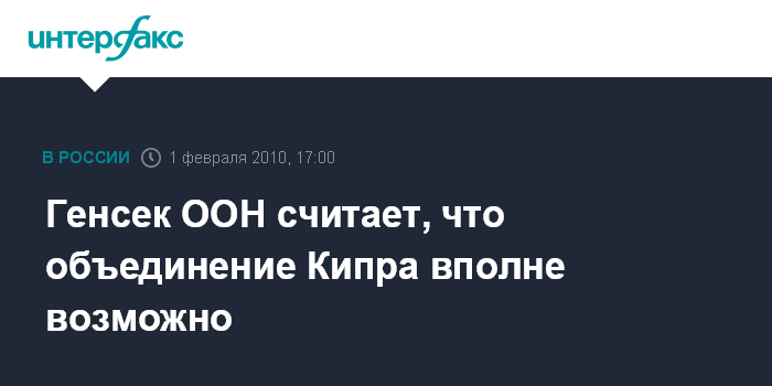 Москва. 1 февраля. INTERFAX.RU - Генеральный секретарь ООН Пан Ги Мун считает достижимым политическое решение проблемы объединения Кипра, сообщает британская телерадиокорпорация BBC. "Я не питаю иллюзий относительно простоты решения проблемы Кипра или относительно трудностей, с которыми вы сталкиваетесь. В то же время я уверен, что решение возможно и достижимо", - сказал он журналистам по прибытии в кипрский город Ларнака, где пройдет новый раунд переговоров по объединению греческой и турецкой частей острова.