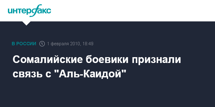 Лондон. 1 февраля. INTERFAX.RU - Боевики из сомалийской группировки "Аш-Шабаб" впервые подтвердили, что действуют в рамках "международного джихада" "Аль-Каиды", сообщает в понедельник BBC.