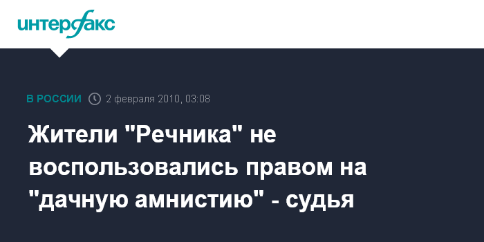 Москва. 2 февраля. ИНТЕРФАКС - В поселке "Речник" жители домов, которые подлежат сносу по решению суда, могли использовать для регистрации своего права на землю и строительство "дачную амнистию", но они этого не сделали, заявила судья Кунцевского суда Москвы Любовь Сергеева.