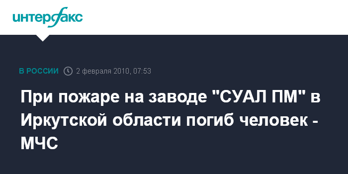 Иркутск. 2 февраля. ИНТЕРФАКС-СИБИРЬ - Один человек погиб в результате сильного возгорания на территории завода "СУАЛ ПМ" в городе Шелехов Иркутской области, сообщил агентству "Интерфакс-Сибирь" источник в Главном управлении МЧС по региону.