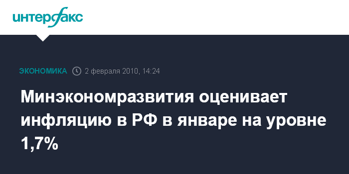 Москва. 2 февраля. INTERFAX.RU – Минэкономразвития оценивает инфляцию в РФ в январе на уровне 1,7%, сообщил журналистам замглавы министерства Андрей Клепач на брифинге во вторник.