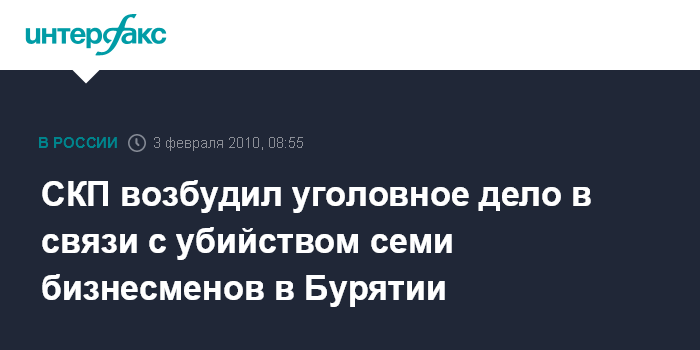 Москва. 3 февраля. INTERFAX.RU - По факту убийства семерых предпринимателей в республике Бурятия возбуждено уголовное дело, сообщили "Интерфаксу" в СКП РФ в среду.