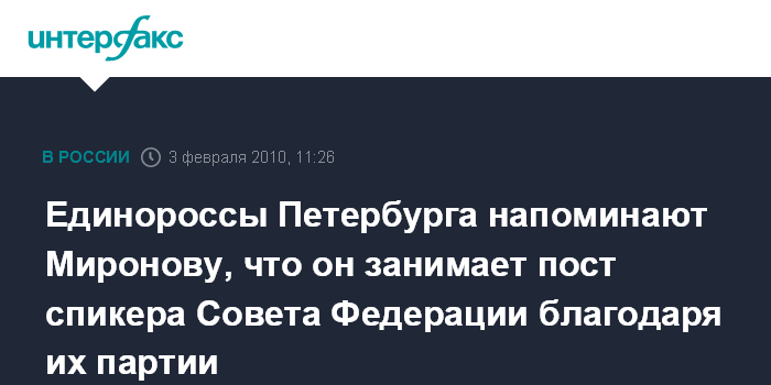 Москва. 3 февраля. INTERFAX.RU – Петербуржские единороссы считают критику Сергеем Мироновым антикризисных мер правительства РФ давлением на Владимира Путина и напоминают спикеру Совета Федерации, что тот занимает свой пост благодаря их партии.
