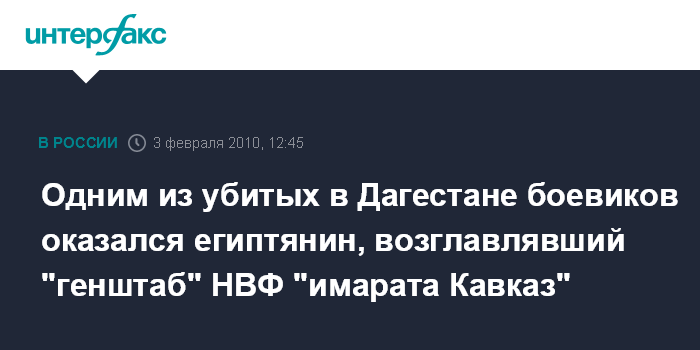 Москва. 3 февраля. INTERFAX.RU - Боевик, уничтоженный в ходе спецоперации в Дагестане, опознан как гражданин Египта Мохмад Мохамад Шабаан по прозвищу Сейф Ислам, находившийся в международном розыске по запросу египетских властей, сообщили агентству "Интерфакс-Юг" в среду в УФСБ РФ по Дагестану. По словам собеседника агентства, он считался организатором сети "Аль-Каиды" на Северном Кавказе, начальником "генштаба" НВФ так называемого "имарата Кавказ".