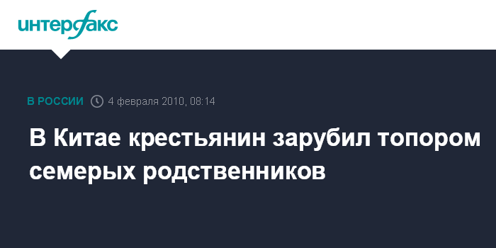 Москва. 4 февраля. INTERFAX.RU - В южной китайской провинции Гуйчжоу крестьянин с минувшую среду зарубил топором семерых родственников, сообщили в четверг местные СМИ.
