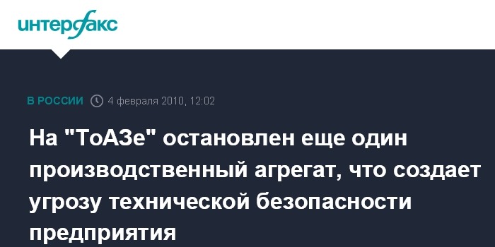На "ТоАЗе" остановлен еще один производственный агрегат, что создает угрозу технической безопасности предприятия