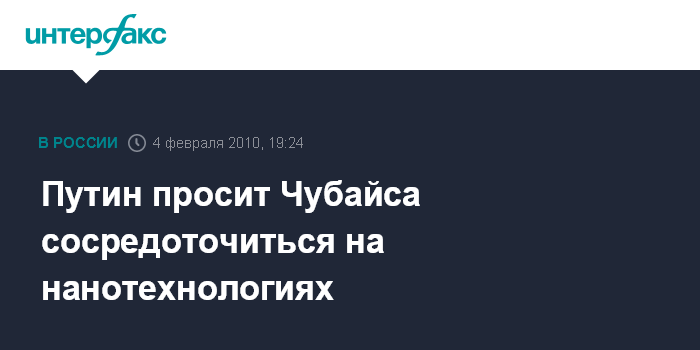 "Я знаю, что вы выходили с предложением расширить тематику, но все-таки вы должны оставаться в рамках тех задач, ради которых корпорация создавалась. Конечно, прежде всего, и главным образом, вы должны заниматься нанотехнологиями", - сказал Путин в ходе встречи в четверг с главой корпорации Анатолием Чубайсом.