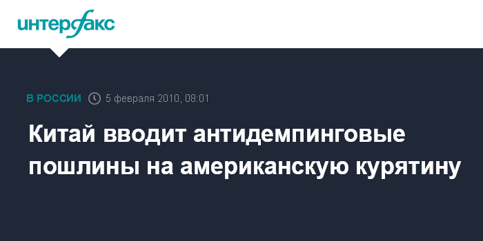 С 13 февраля 2010 года при экспорте в КНР продуктов из курятины, список которых определен Минкоммерции Китая, американские компании-поставщики должны будут внести в таможенные органы Китая соответствующие залоги, гарантирующие выплату пошлин.