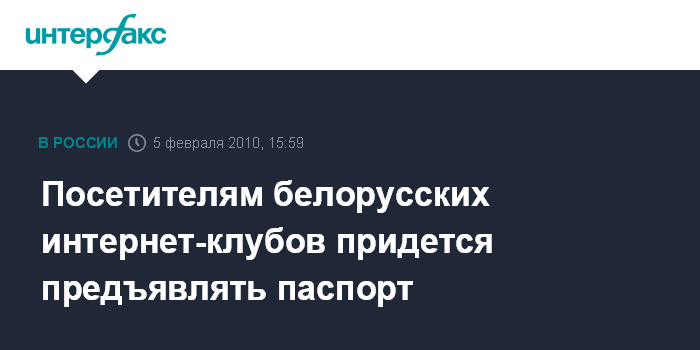 Москва. 5 февраля. INTERFAX.RU - Пользователи интернет-услуг в коллективных пунктах доступа в Белоруссии должны будут предъявлять паспорт для идентификации, сообщил журналистам на пресс-конференции в пятницу в Минске министр связи и информатизации Белоруссии Николай Пантелей. "Как я понимаю, пользователям интернет-услуг в интернет-клубах придется предъявлять документ, удостоверяющий личность, потому что указ предусматривает для интернет-клубов идентификацию не абонентского устройства, а персоналии", - сказал Пантелей, комментируя принятие указа президента "О мерах по совершенствованию использования национального сегмента сети Интернет".