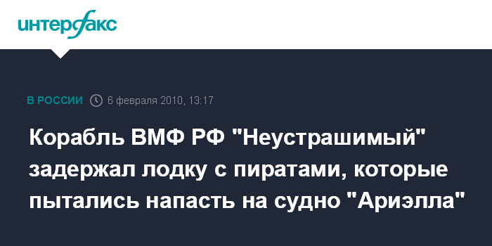 Москва. 6 февраля. INTERFAX.RU - Сторожевой корабль ВМФ России "Неустрашимый" задержал лодку с семью пиратами на борту, принимавшую участие в попытке захвата судна "Ариэлла", шедшего под флагом Антигуа и Барбуда, сообщил официальный представитель ВМФ в субботу.