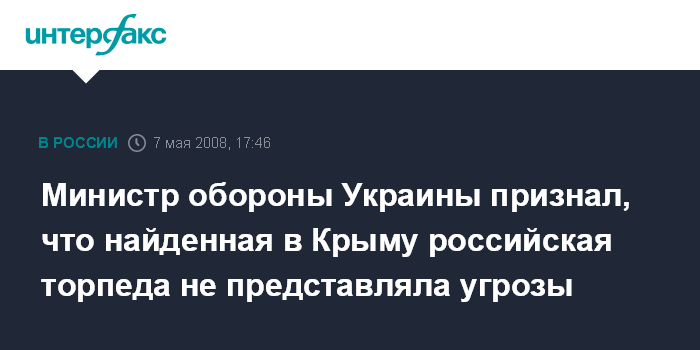 Москва. 7 мая. INTERFAX.RU - Министр обороны Украины Юрий Ехануров считает, что найденная в Крыму российская авиационная торпеда не несла угрозы окружающей среде. Об этом он заявил журналистам после поздравления ветеранов Великой отечественной войны в среду.