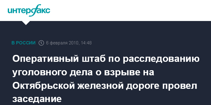 Москва. 6 февраля. INTERFAX.RU - Председатель Следственного комитета при прокуратуре РФ Александр Бастрыкин провел в субботу заседание оперативного штаба по расследованию уголовного дела о взрыве на Октябрьской железной дороге, произошедшего 2 февраля 2010 года на перегоне станций Броневая – Лигово. Об этом сообщил "Интерфаксу" официальный представитель СКП РФ Владимир Маркин.