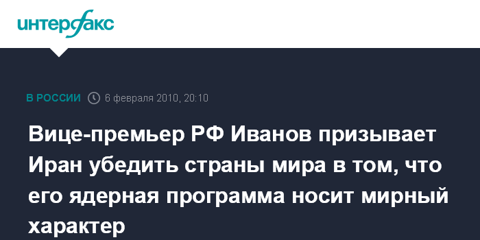 Вице-премьер РФ Иванов призывает Иран убедить страны мира в том, что его ядерная программа носит мирный характер