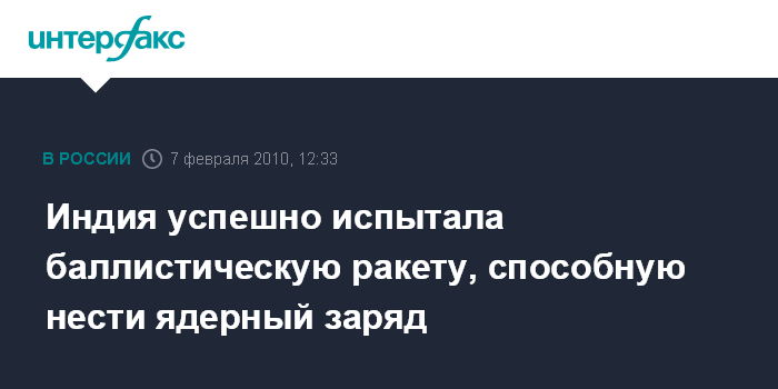 Дели. 7 февраля. INTERFAX.RU - Индия провела успешный запуск баллистической ракеты средней дальности Agni-III. Эта ракета способна нести ядерный боезаряд и поражать точечные цели на большей части Азии и Ближнего Востока. "Четвертые испытания модификации ракеты Agni-III класса "земля-земля" подтвердили все предварительные расчеты, дав превосходный результат", - сообщили журналистам источники в министерстве обороны Индии в воскресенье.