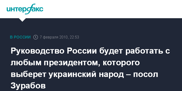 Киев. 7 февраля. INTERFAX.RU - Руководство Российской Федерации готово к активному сотрудничеству с любым президентом, которого выберут украинские граждане, заявил посол РФ в Киеве Михаил Зурабов.