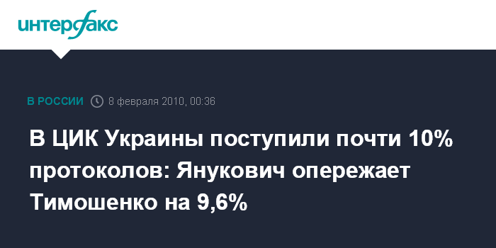 Киев. 8 февраля. INTERFAX.RU - По данным обработки 9,78% протоколов участковых избирательных комиссий, за Виктора Януковича на президентских выборах проголосовали 52,22% избирателей, за Юлию Тимошенко - 42,55%, не поддержали ни одного кандидата 4,17%.
