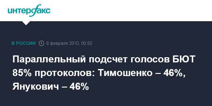 Киев. 8 февраля. INTERFAX.RU - Глава избирательного штаба Юлии Тимошенко Александр Турчинов заявляет, что согласно параллельному подсчету БЮТ по 85% протоколов Ю.Тимошенко набирает 46% голосов избирателей, Виктор Янукович - также 46%.