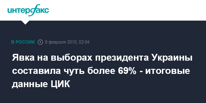 Киев. 8 февраля. ИНТЕРФАКС-УКРАИНА - Явка избирателей во втором туре президентских выборов на Украине составила 69,07%.