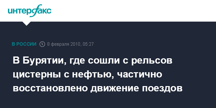 Чита. 8 февраля. ИНТЕРФАКС-СИБИРЬ - Движение поездов в Заиграивском районе Бурятии, где в воскресенье сошли с рельс семь цистерн с нефтепродуктами, восстановлено по одному из железнодорожных путей.