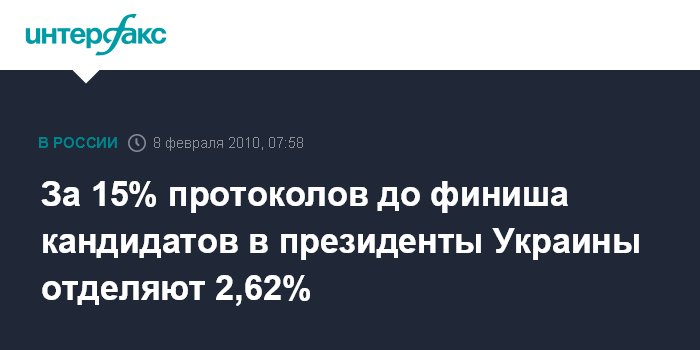 Киев. 8 февраля. ИНТЕРФАКС-УКРАИНА - По данным обработки 85,02% протоколов участковых избирательных комиссий, за Виктора Януковича на президентских выборах проголосовали 48,48% (10 млн. 313 тыс. 297 избирателей), за Юлию Тимошенко - 45,86% (9 млн. 755 тыс. 4 человека).