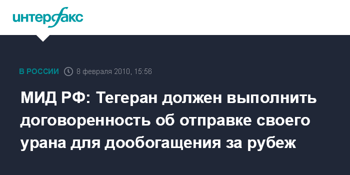 Москва. 8 февраля. INTERFAX.RU - В Москве заявляют, что Иран должен выполнить достигнутые ранее договоренности, согласно которым его уран направляется для дообогащения за рубеж. "Мы по-прежнему исходим из того, что выход из сложившейся ситуации заключается в выполнении Ираном достигнутых 1 октября прошлого года в Женеве договоренностей, предусматривающих отправку топлива для тегеранского исследовательского центра для дообогащения за рубеж", - заявили в понедельник "Интерфаксу" в департаменте информации и печати МИД РФ. Так во внешнеполитическом ведомстве прокомментировали сообщение о том, что Иран в понедельник формально уведомил МАГАТЭ о намерении начать со вторника работы по обогащению урана до 20% на своей территории.