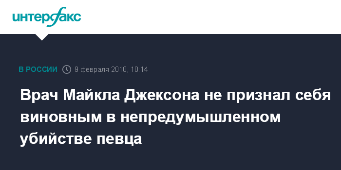 Москва. 9 февраля. INTERFAX.RU - Личный врач Майкла Джексона Конрад Мюррей не признал вину в убийстве певца в окружном суде Лос-Анджелеса, сообщает во вторник газета "Лос-Анджелес таймс".