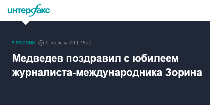 Москва. 9 февраля. INTERFAX.RU - Президент России Дмитрий Медведев направил поздравление политическому обозревателю радио "Голос России", писателю, историку, почетному президенту Федерации мира и согласия Валентину Зорину в связи с 85-летием, сообщили "Интерфаксу" в пресс-службе Кремля. "Более 60 лет Вы работаете в информационной сфере и принадлежите к плеяде выдающихся журналистов-международников. Ваши яркие репортажи и статьи, многочисленные теле-и радиопередачи, посвященные важнейшим проблемам мировой политики, вошли в "золотой фонд" отечественной журналистики. А такие книги как "Владыки без масок", "Неизвестное об известном" и другие - и сегодня пользуются успехом у широкой читательской аудитории", - отмечается, в частности, в поздравлении главы государства.