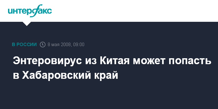 Хабаровск. 8 мая. INTERFAX.RU - Управление Роспотребнадзора по Хабаровскому краю выразило озабоченность в связи с эпидемией энтеровирусной инфекции, зарегистрированной в нескольких китайских провинциях.