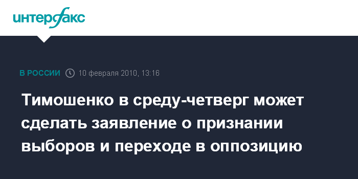 Москва. 10 февраля. INTERFAX.RU – Премьер-министр Украины Юлия Тимошенко в среду-четверг может сделать заявление о признании результатов выборов президента и переходе в оппозицию, прогнозирует депутат БЮТ Святослав Олийнык.
