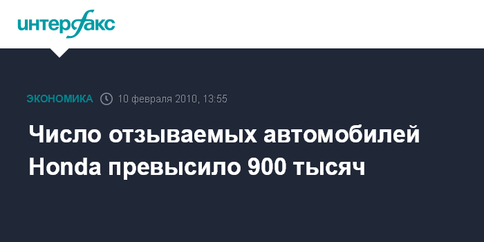 Москва. 10 февраля. IFX-NEWS - Второй по величине японский автопроизводитель - Honda Motor Co. - отозвал дополнительные модели автомобилей 2001 и 2002 гг. Общее количество отзываемых по всему миру автомашин превышает 900 тыс., сообщает издание MarketWatch.