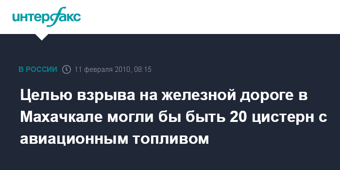 Москва. 11 февраля. INTERFAX.RU - Последствия взрыва на железнодорожном полотне в Махачкале могли быть катастрофическими: недалеко от места происшествия находился состав с 20 цистернами авиационного топлива.