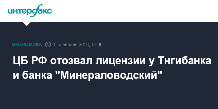 Москва. 11 февраля. INTERFAX.RU - ЦБ РФ отозвал лицензии на осуществление банковских операций у Тнгибанка (Томск) и "Минераловодский" (Ставропольский край, г.Минеральные воды), говорится в сообщении департамента внешних и общественных связей Банка России.