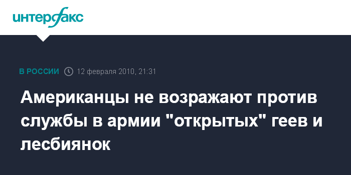 Вашингтон. 12 февраля. INTERFAX.RU - Примерно три четверти американцев поддерживают предложение о приеме на службу в армию гомосексуалистов, которые не скрывают своей сексуальной ориентации, говорится в опросе, результаты которого публикует в пятницу газета Washington Post.