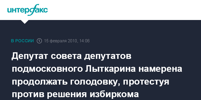 Москва. 15 февраля. INTERFAX.RU - Депутат совета депутатов подмосковного Лыткарина единоросс Татьяна Варламова объявила голодовку, протестуя против решения избиркома, отказавшего ей в регистрации на пост главы Лыткарина.