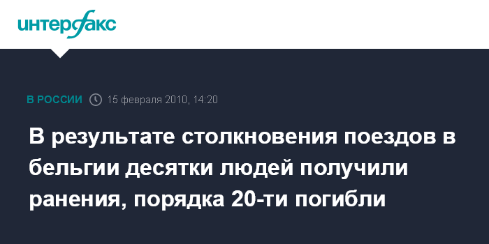 Брюссель. 15 февраля. INTERFAX.RU - Столкновение двух пассажирских поездов произошло в понедельник утром близ Брюсселя, сообщает бельгийское телевидение. По предварительным данным полиции, объявленным через 2 часа после аварии, погибло не менее десятка человек. Местные источники говорят о двух десятках. Представитель железной дороги Ан Вуанье сказала о "десятках тяжело раненых".