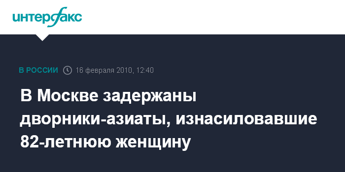 Москва. 16 февраля. INTERFAX.RU – Столичные милиционеры задержали двух дворников, уроженцев азиатских республик, которые изнасиловали на улице 82-летнюю женщину, сообщил "Интерфаксу" источник в правоохранительных органах во вторник.