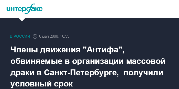 Москва. 8 мая. INTERFAX.RU - Ленинский районный суд Петербурга вынес условный приговор по делу о драке между активистами Движения против нелегальной иммиграции (ДПHИ) и членами движения "Антифа".