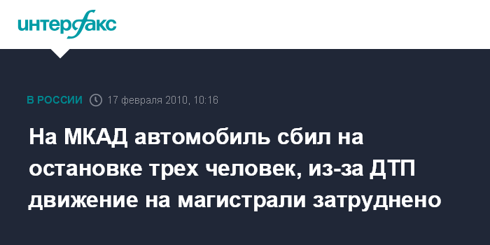 Москва. 17 февраля. INTERFAX.RU – Серьезное ДТП произошло в среду утром между 35-м и 37-м км Московской кольцевой автодороги, автомобиль сбил трех человек на автобусной остановке, сообщил "Интерфаксу" источник в правоохранительных органах столицы.