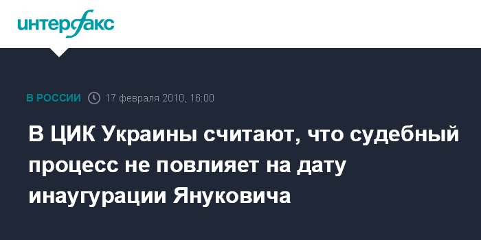 Киев. 17 февраля. INTERFAX.RU - Заместитель председателя Центральной избирательной комиссии Украины Андрей Магера уверен, что судебный процесс не повлияет на проведение инаугурации нового президента, которая назначена на 25 февраля.
