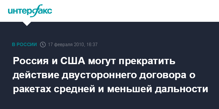 Москва. 17 февраля. INTERFAX.RU - Россия и США планируют рассмотреть вопрос о возможном прекращении действия двустороннего договора об уничтожении ракет средней и меньшей дальности (РСМД), заявил в среду журналистам военно-дипломатический источник в Москве.
