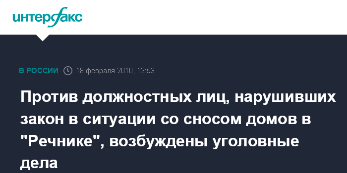 Москва. 18 февраля. INTERFAX.RU – В связи со сносом домов в поселке "Речник" возбуждено четыре уголовных дела в отношении должностных лиц, заявил заместитель генпрокурора РФ Евгений Забарчук.