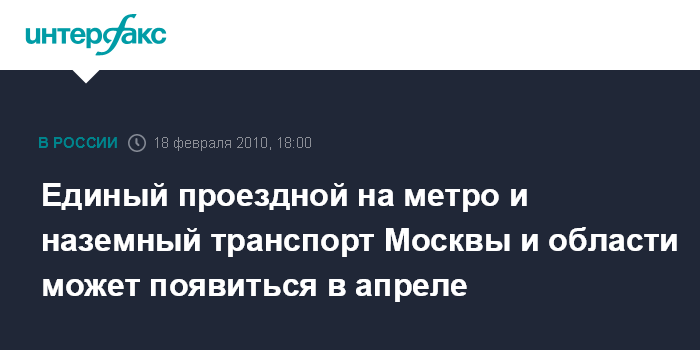 Москва. 18 февраля. INTERFAX.RU - С апреля должна заработать единая транспортная карта, объединяющая наземный транспорт Москвы с метрополитеном и транспортом Подмосковья, сообщил в ходе он-лайн приема в четверг начальник метрополитена Дмитрий Гаев. По его словам, будет единый бланк, по которому, оплатив соответствующий тариф, можно проехать на разных видах транспорта.